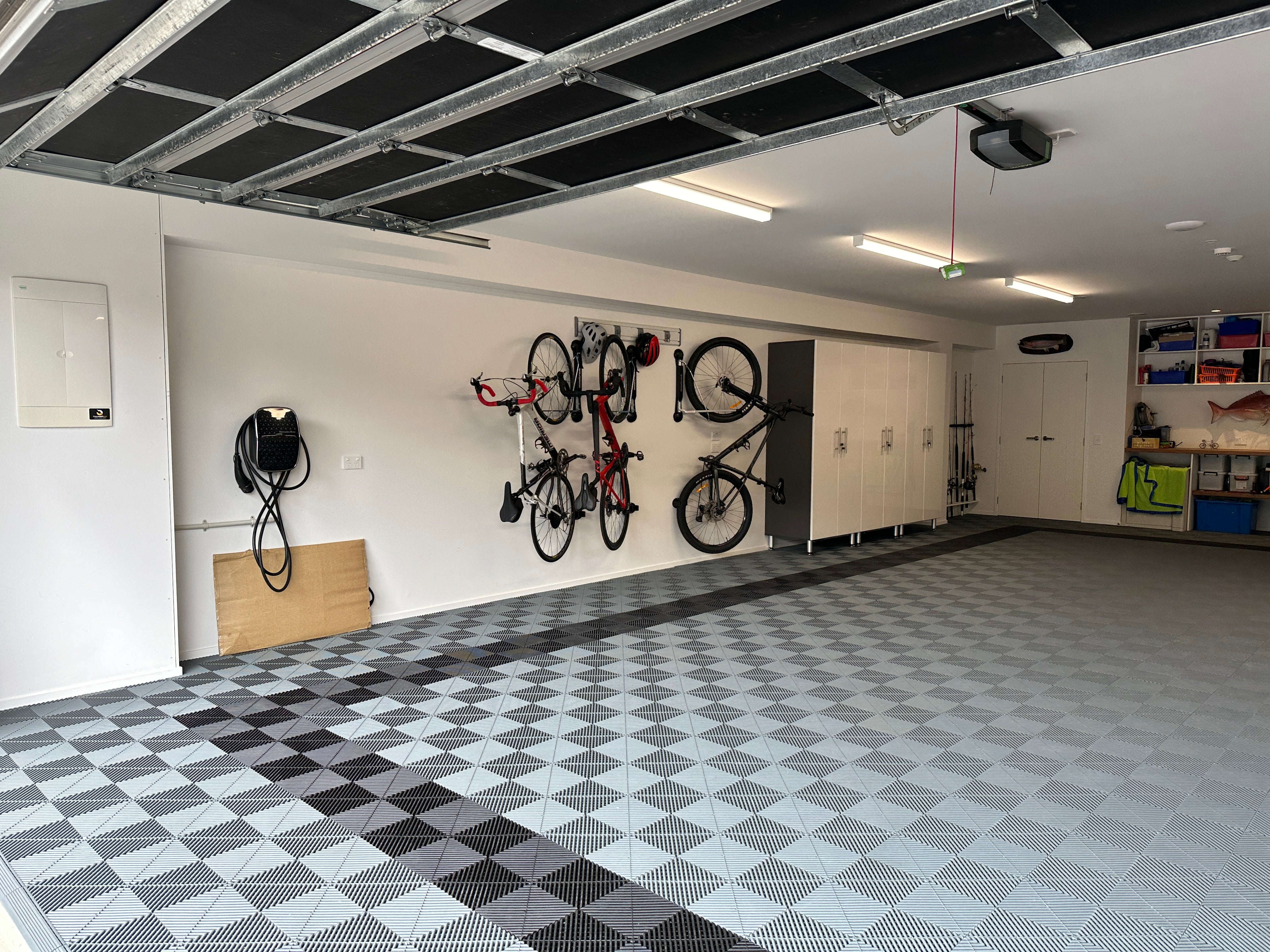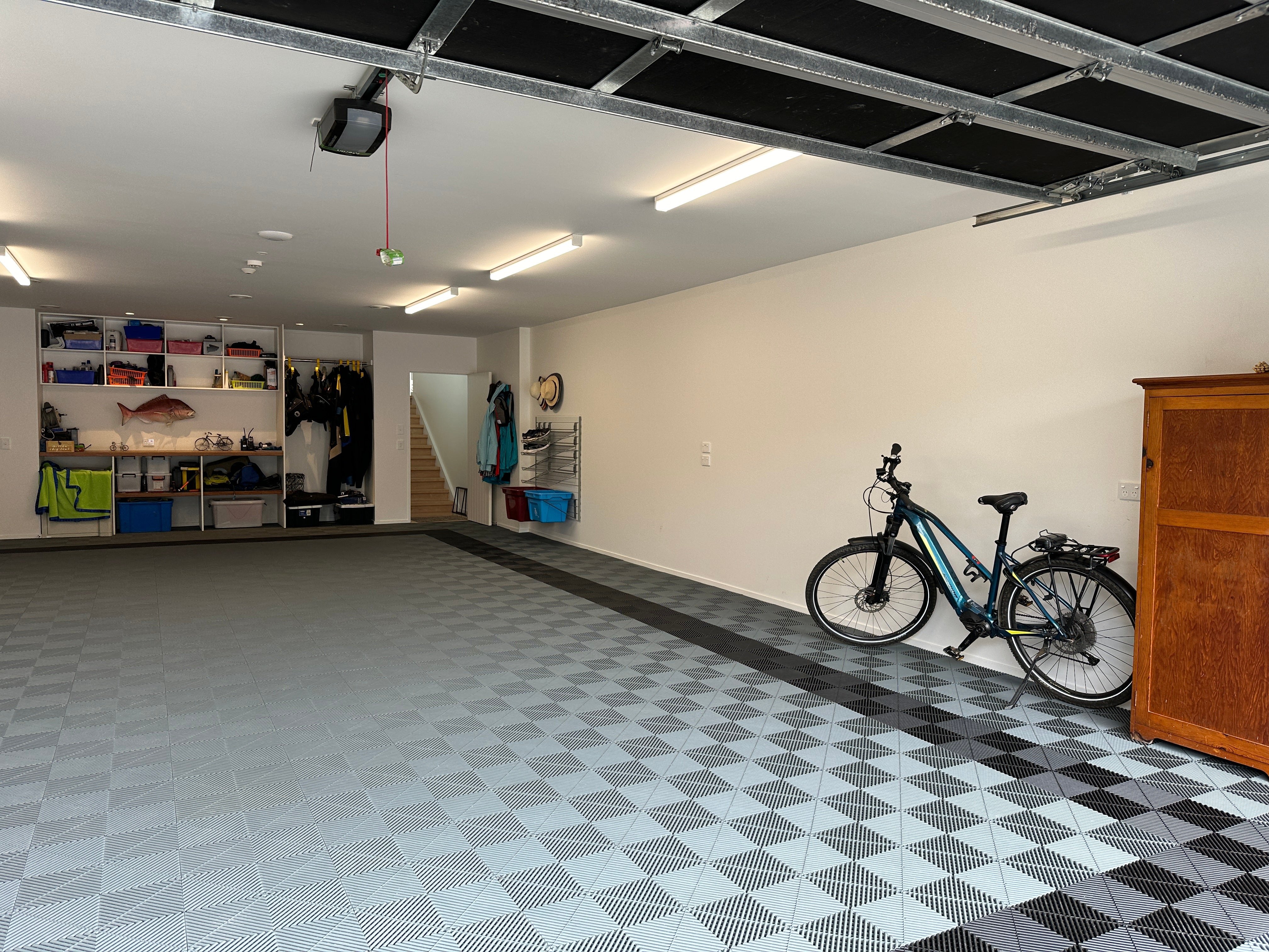 The patented SwissTrax flooring provided a striking and bright look. Some stylish cabinets compliments custom shelves at the back and bikes, shoes and recycling bins are kept off the floor.