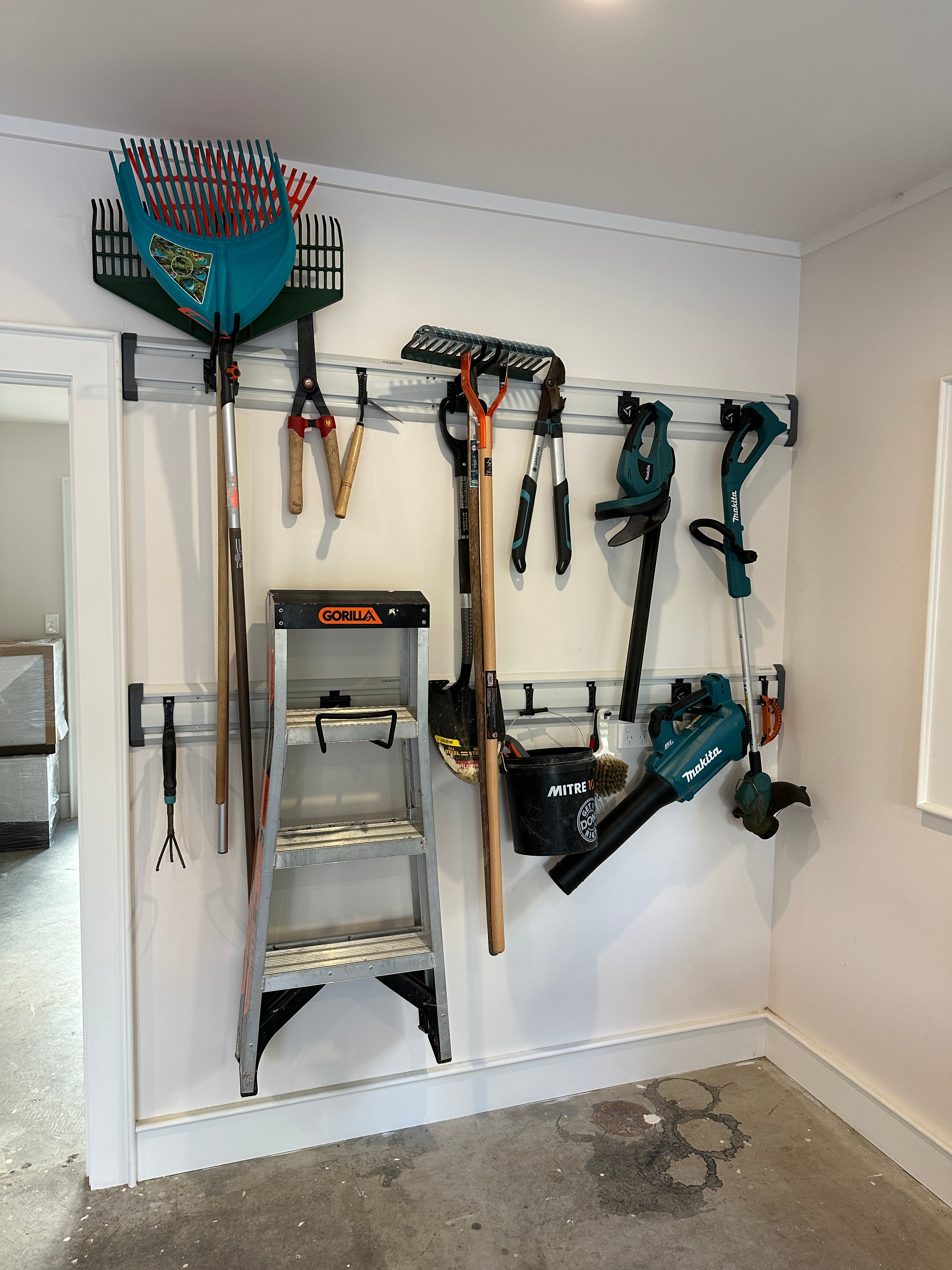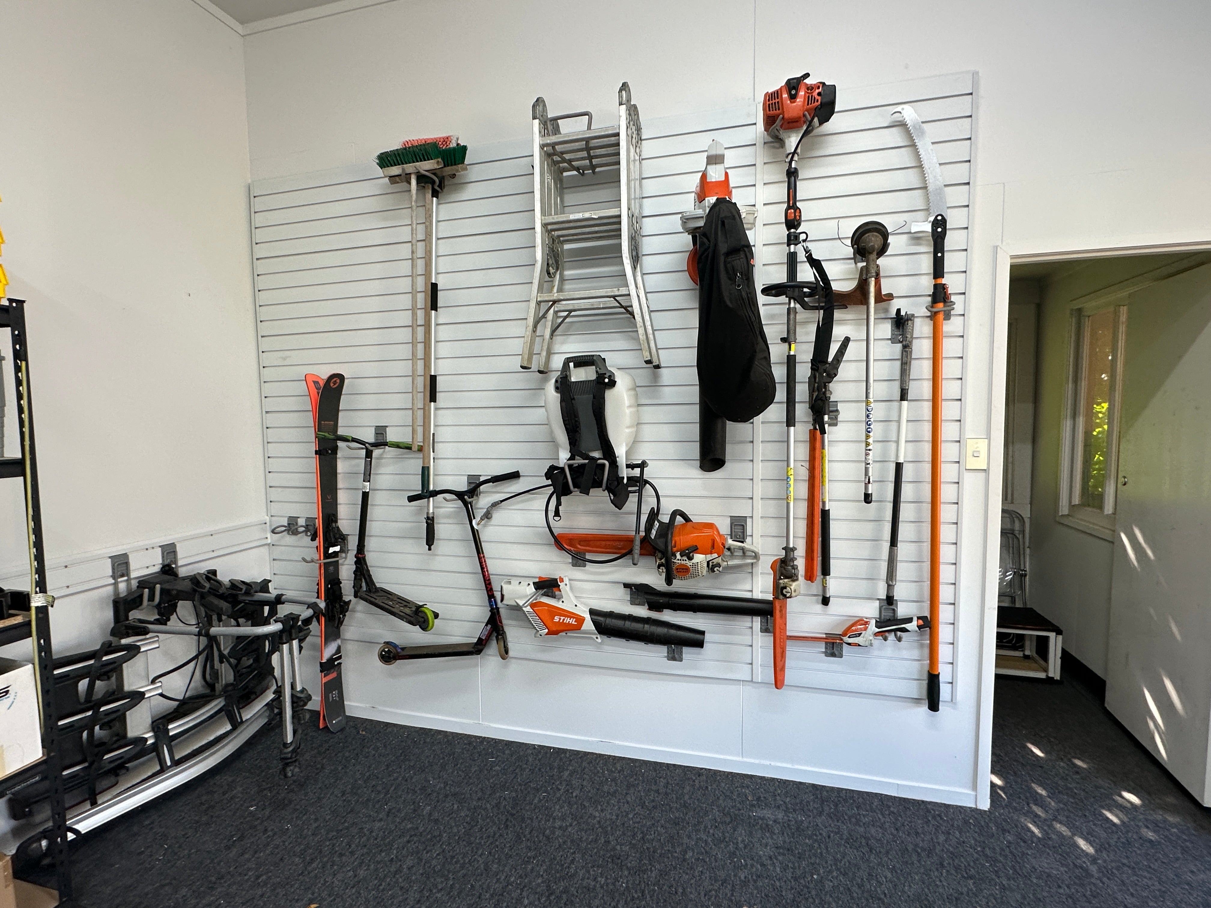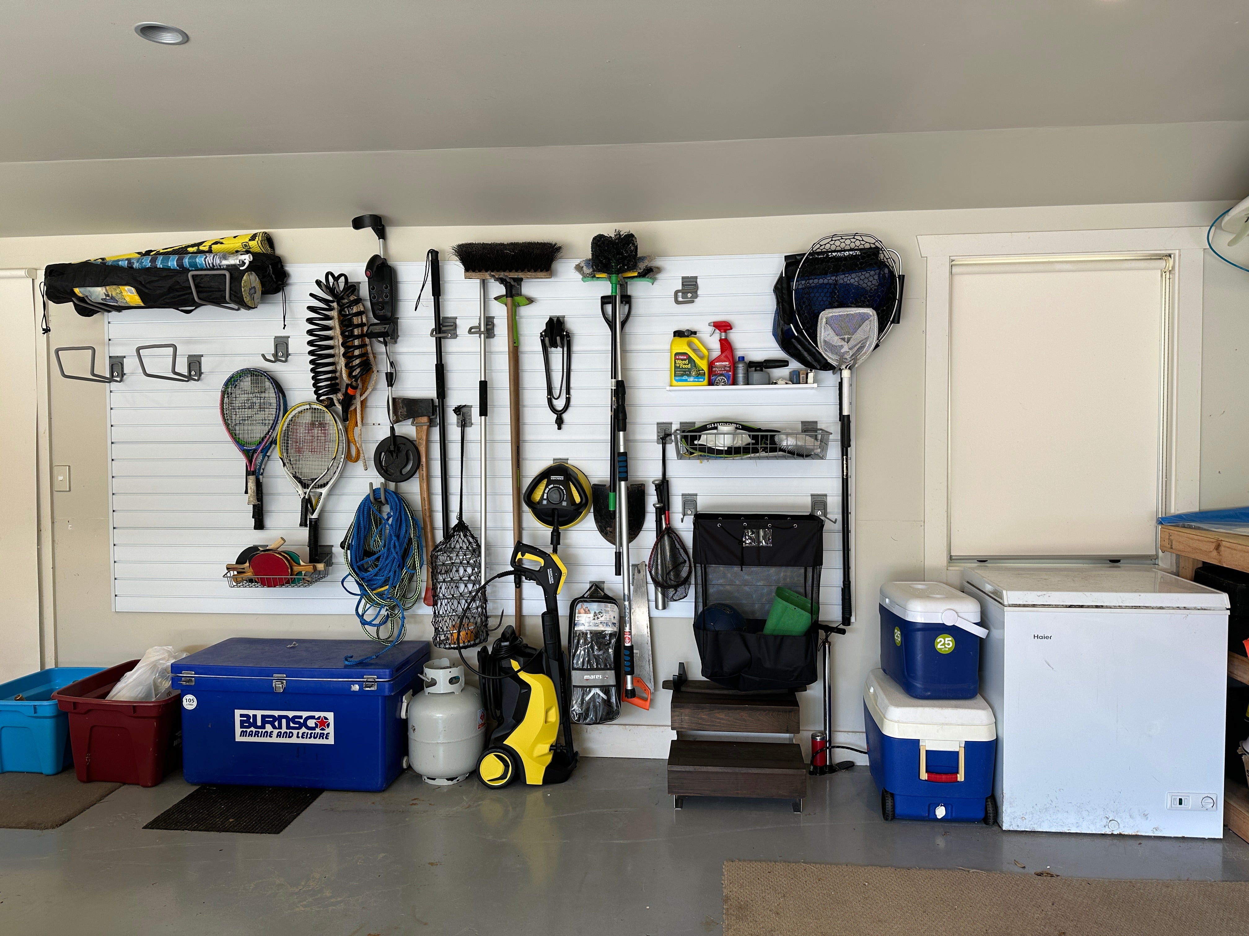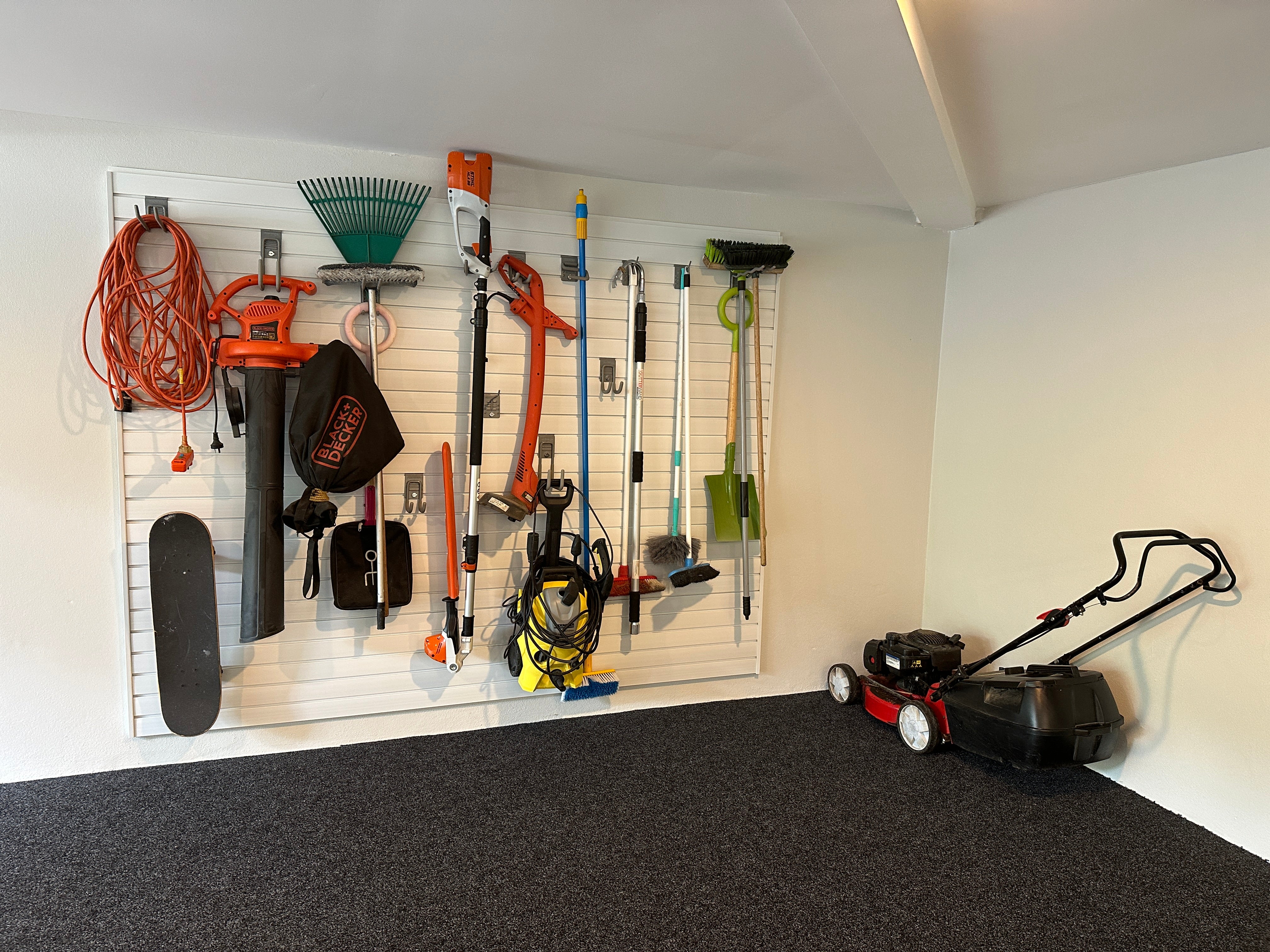 Whether its garden tools, fishing gear, or family recreation equipment, getting stuff off the floor, but easy to access is a fantastic way to declutter. This garage slatwall system has a hook for almost everything!