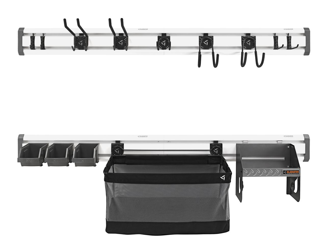 Kit contains four 32-in GearTrack® Channels, 2 x Big Hooks, Twin Hook, Mesh Basket, Clean-Up Caddy, 2 x Tool Hooks, 3 x Small Bins, 4 x J & L Hooks, 8 x End Caps, 32 x 2" Screws